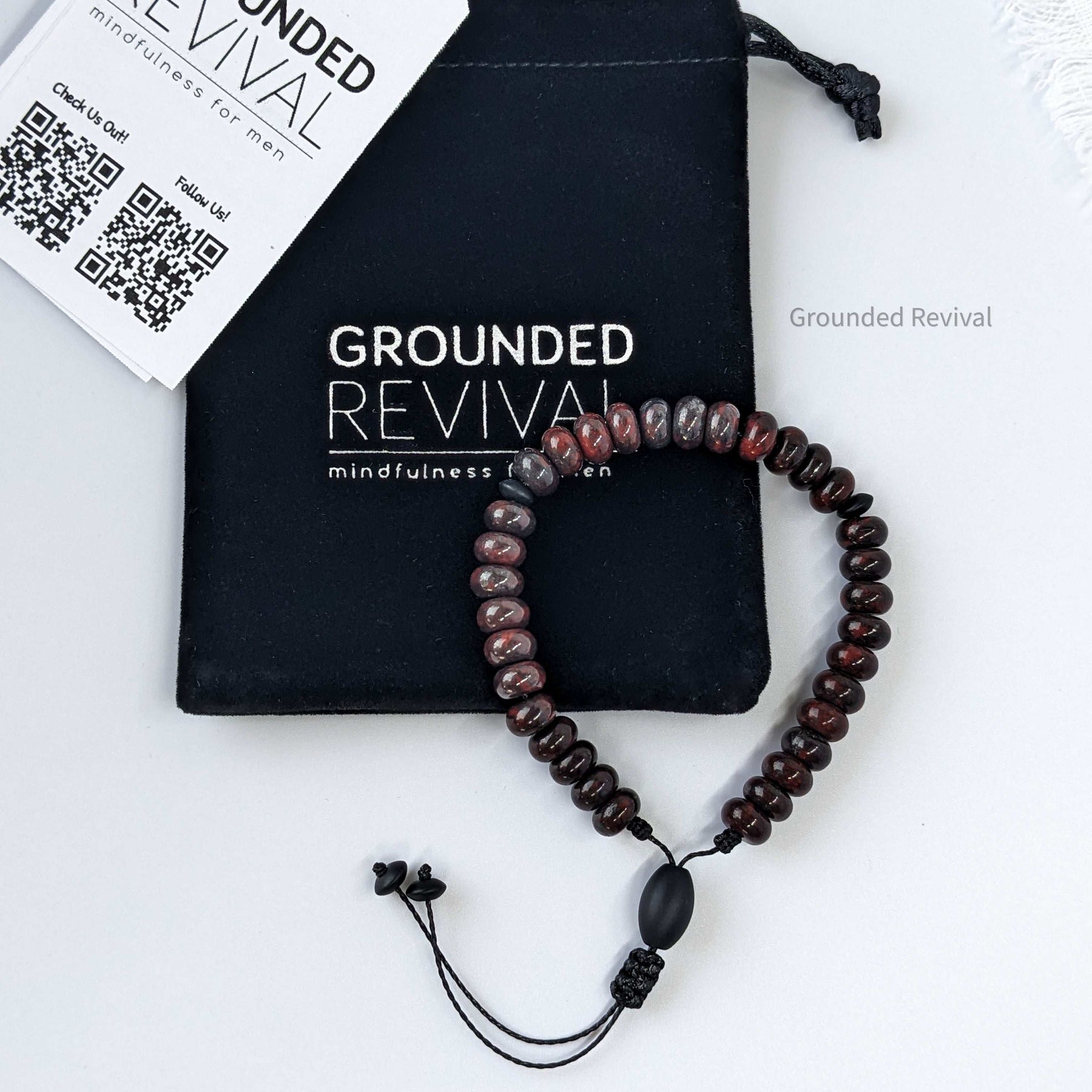 Power in contrast. This tasbih bracelet is handcrafted with Red Bloodstone rondelle beads, each 5x8mm, and strung on a durable, fray-resistant cord. The stone’s deep black base is naturally accented with variable red markings, giving each bead its own distinctive character and bold presence. The disc shape provides a comfortable, secure fit around the wrist, creating a steady, tactile feel during dhikr or daily wear. Finished with a sliding macramé lock braid and adjustable knots, this bracelet embodies durability, balance, and quiet strength.