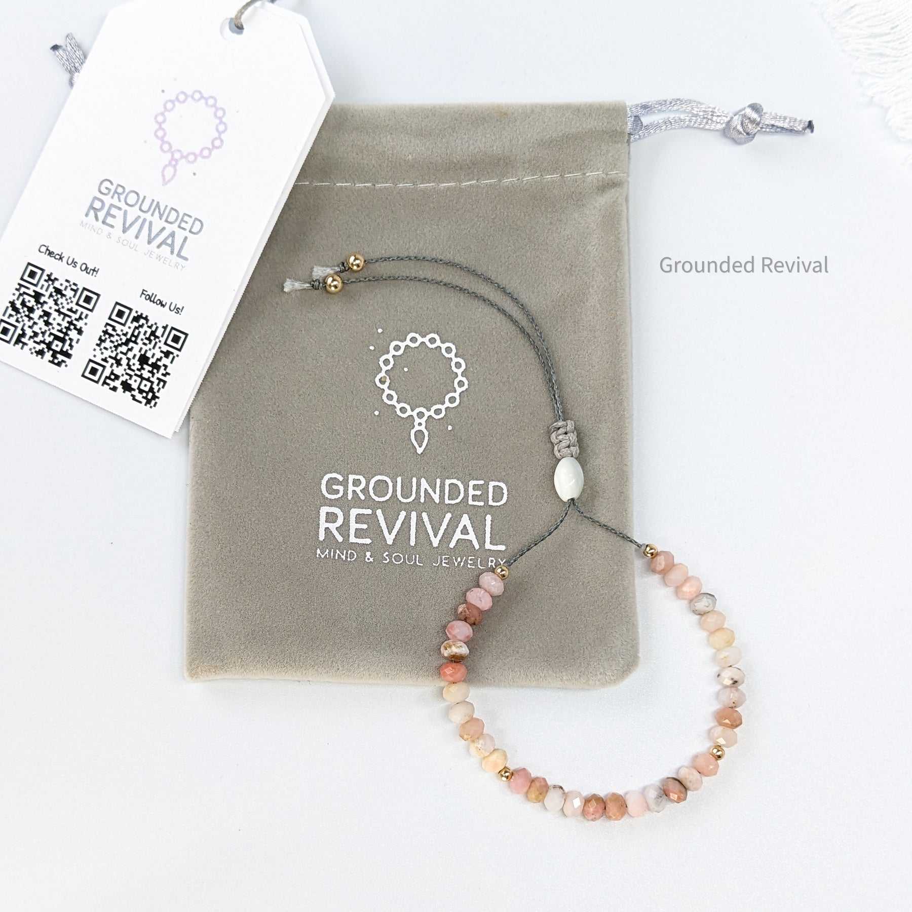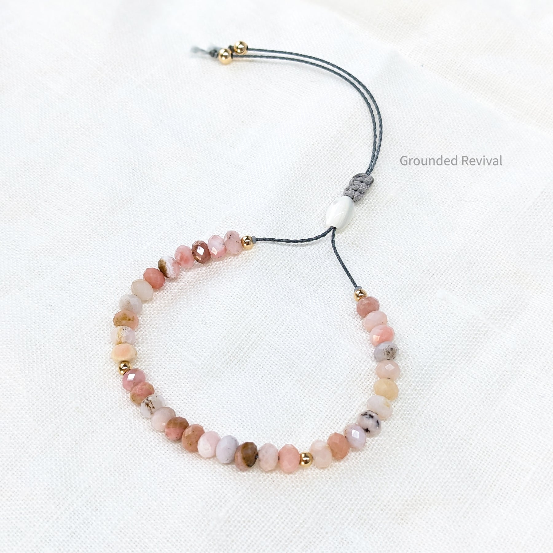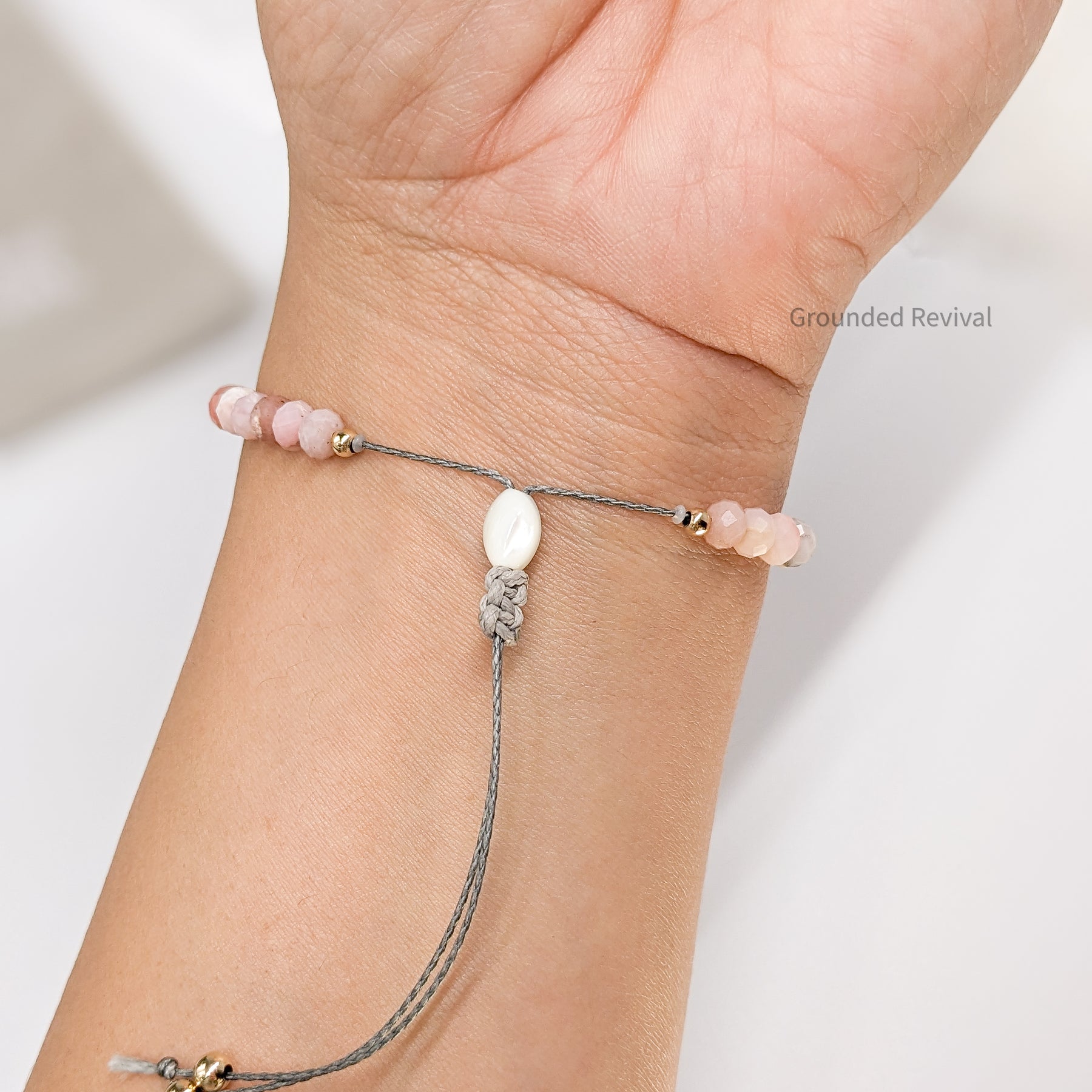 Soft. Graceful. Grounded. This tasbih bracelet is handcrafted with faceted Pink Opal rondelle beads, each 4x6mm, reflecting gentle hues of blush and rose. The delicate facets catch the light beautifully, adding a subtle sparkle that feels both elegant and serene. Known for its smooth polish and silky luster, Pink Opal carries a natural warmth that complements its refined tone. Each bead glides effortlessly through the fingers, offering a peaceful rhythm during dhikr or quiet reflection. Finished with a sliding macramé braid for an adjustable fit, this bracelet embodies a balance of femininity, devotion, and mindful design.