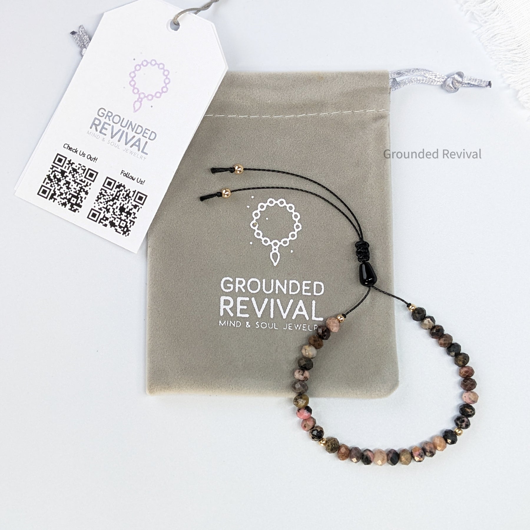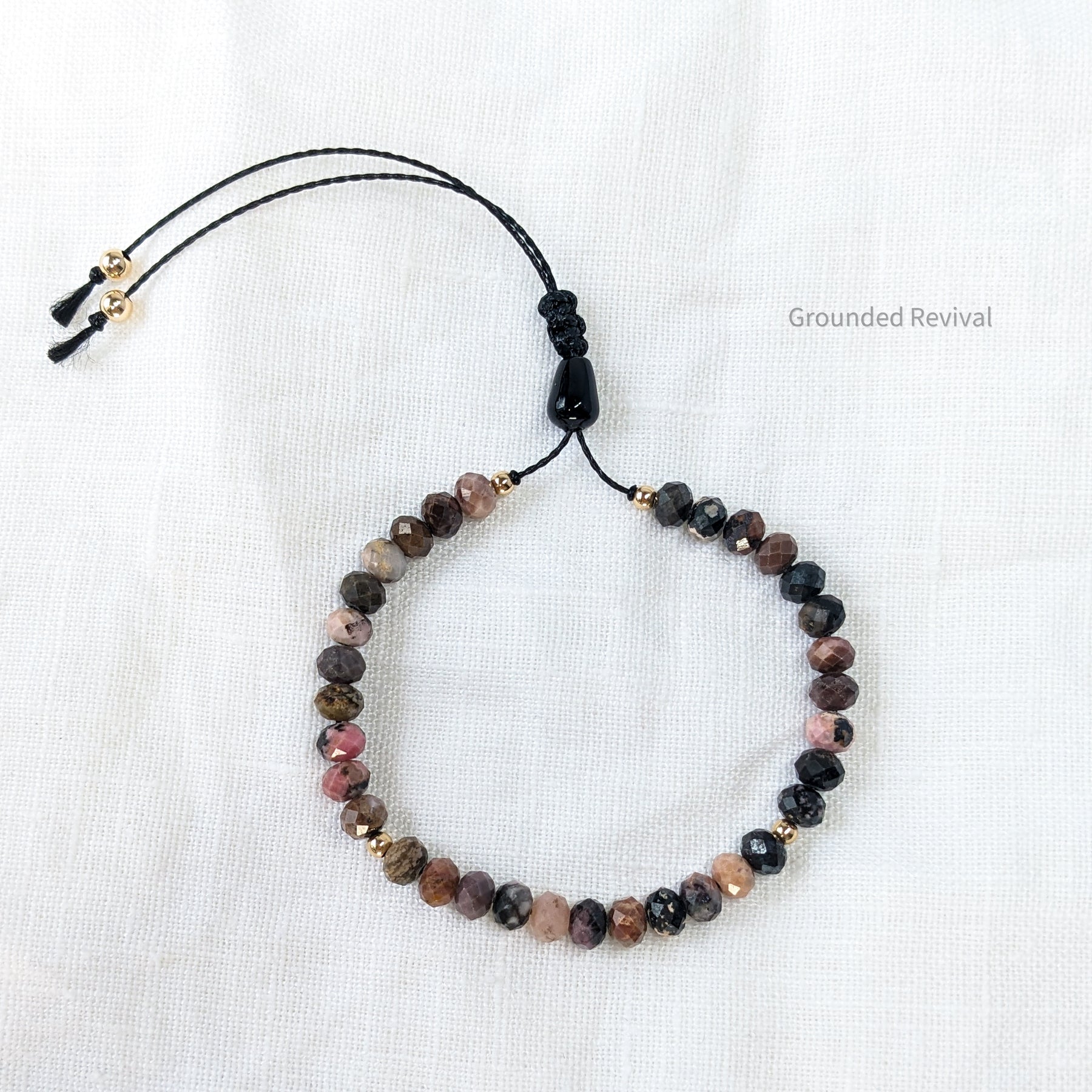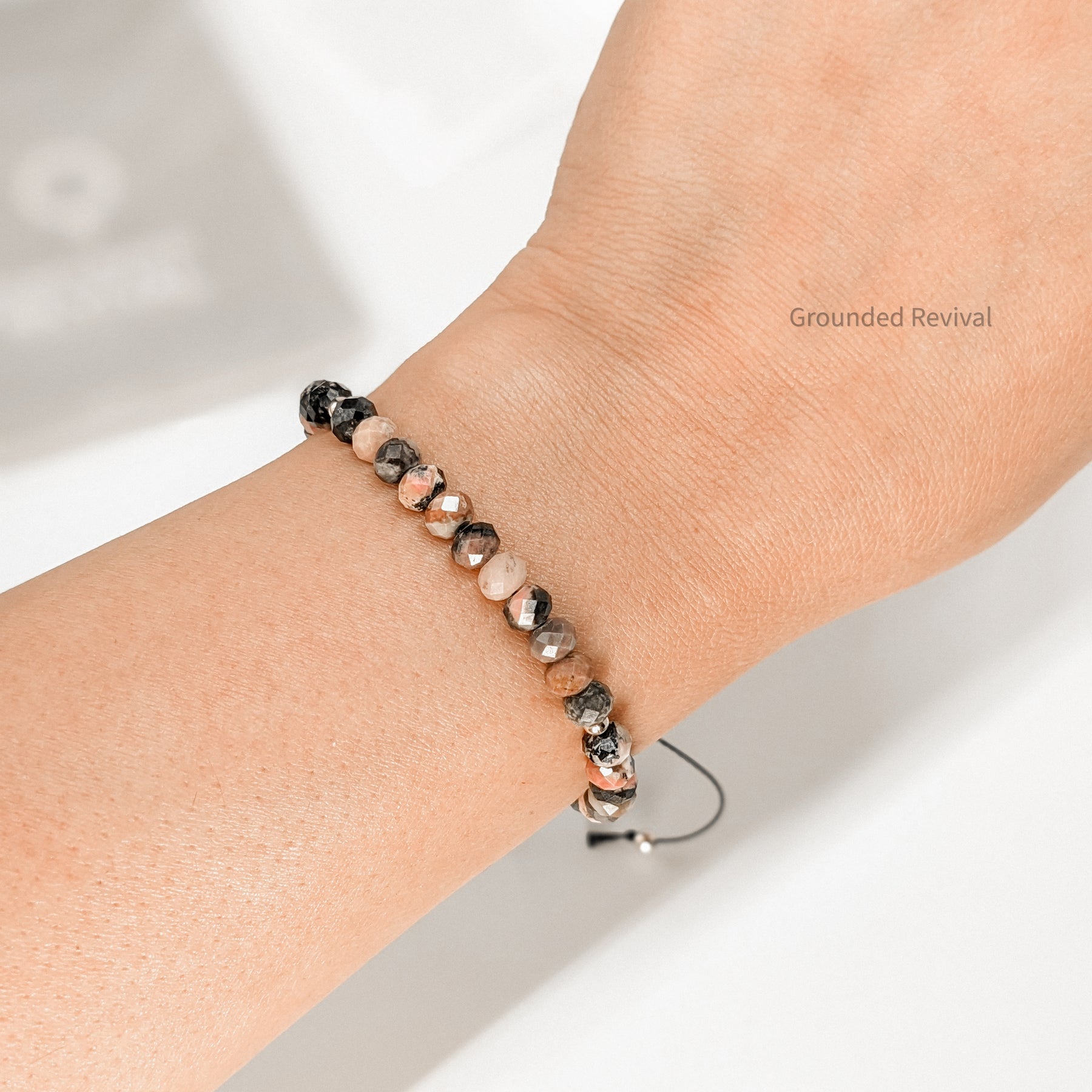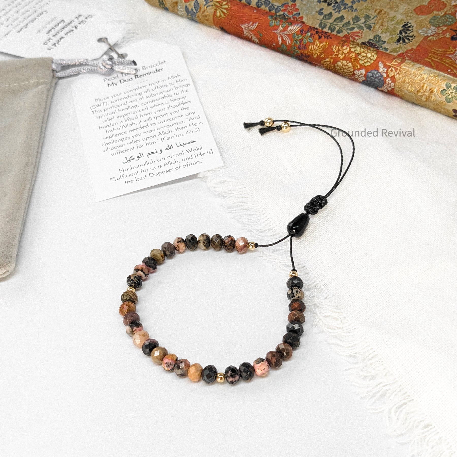 Strength in softness. This tasbih bracelet is handcrafted with faceted Rhodonite rondelle beads, each 4x6mm, showcasing natural shades of rose and deep charcoal veining. The fine facets catch light with subtle brilliance, enhancing the stone’s distinctive contrast and smooth polish. Known for its unique marbled appearance and silky texture, Rhodonite offers a tactile rhythm that feels grounding with every bead passed in dhikr. Completed with an adjustable sliding macramé lock braid, this bracelet blends elegance and resilience—made for women who carry their faith with quiet strength and grace.