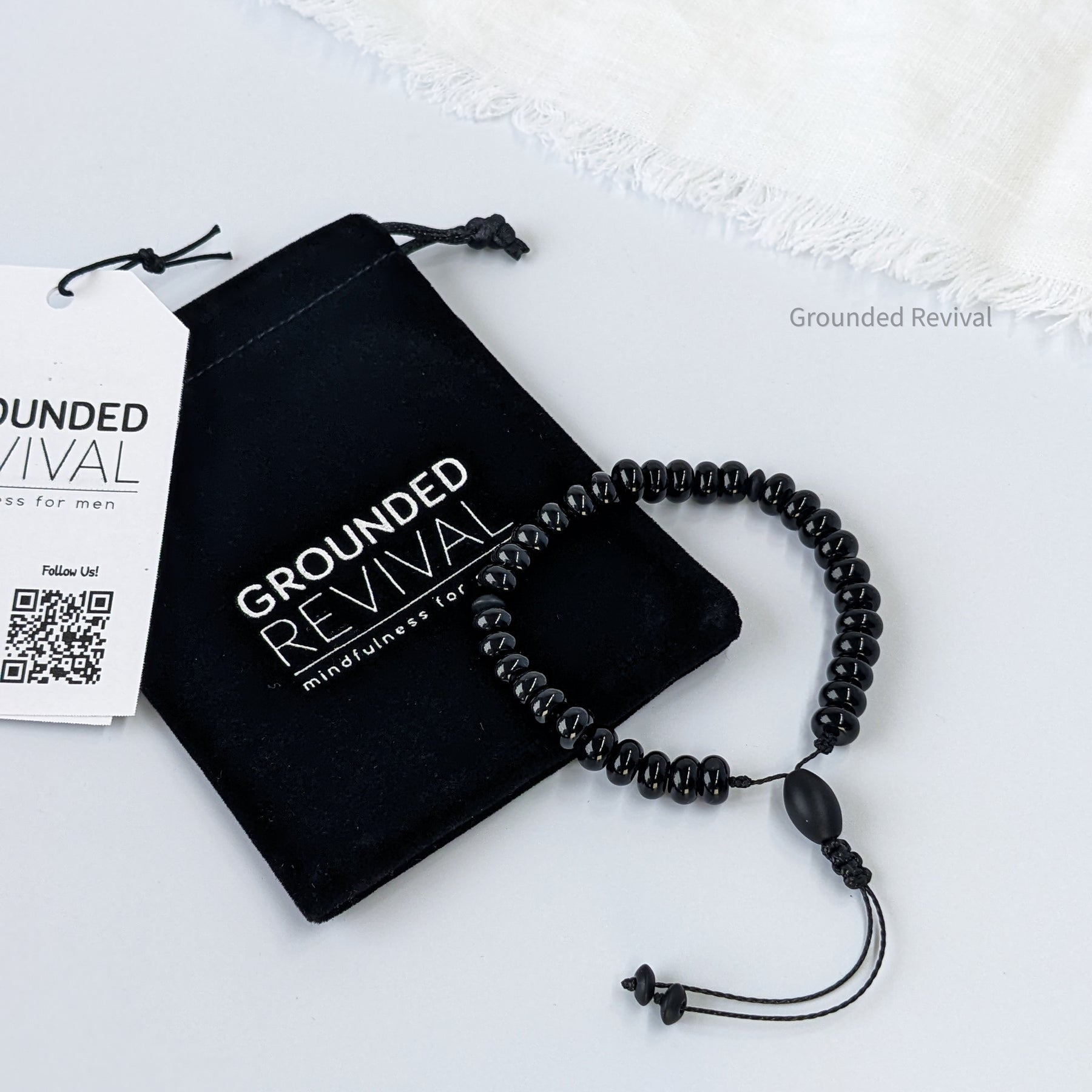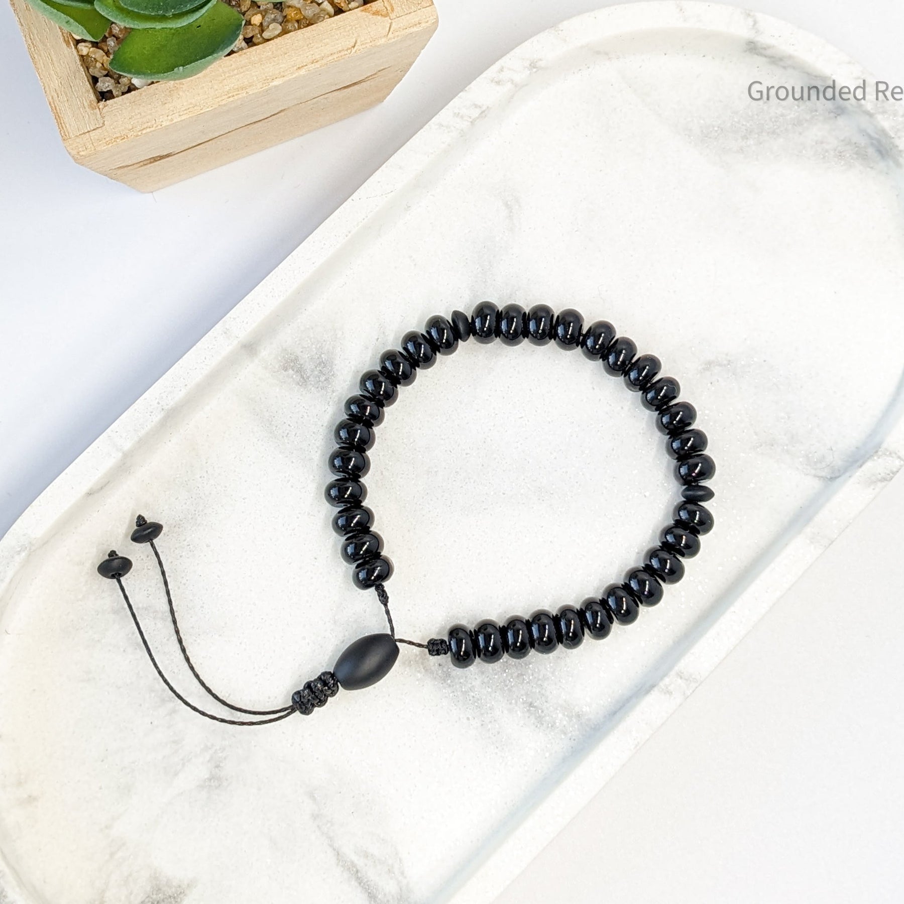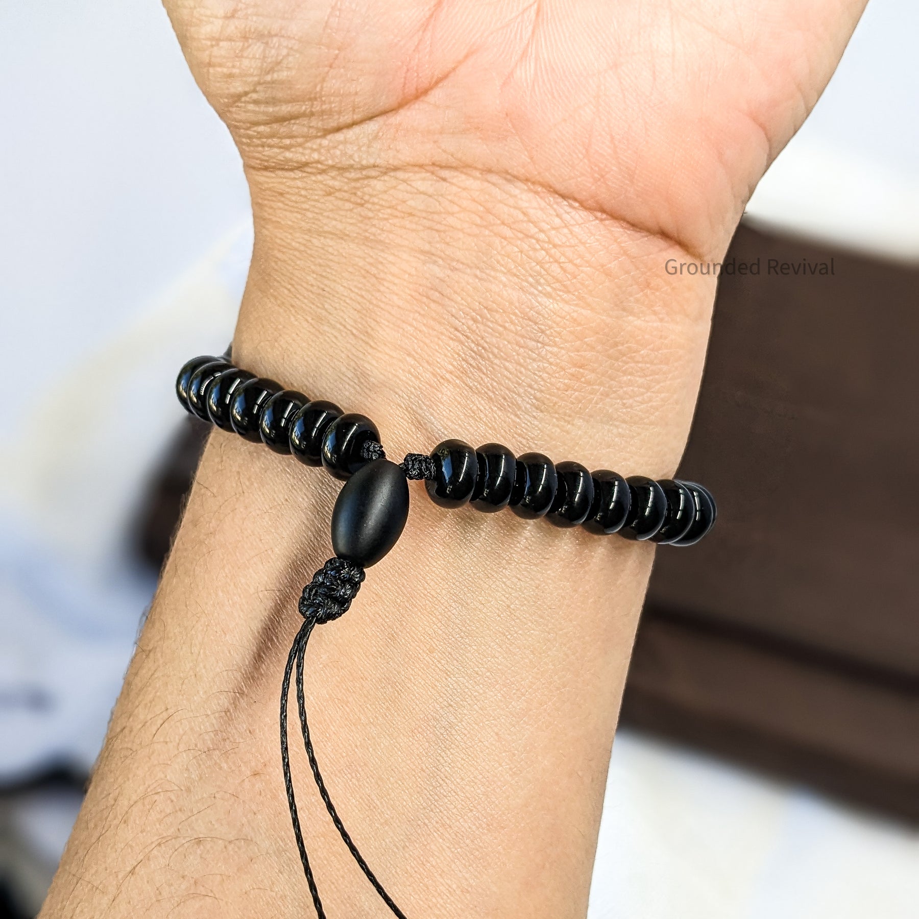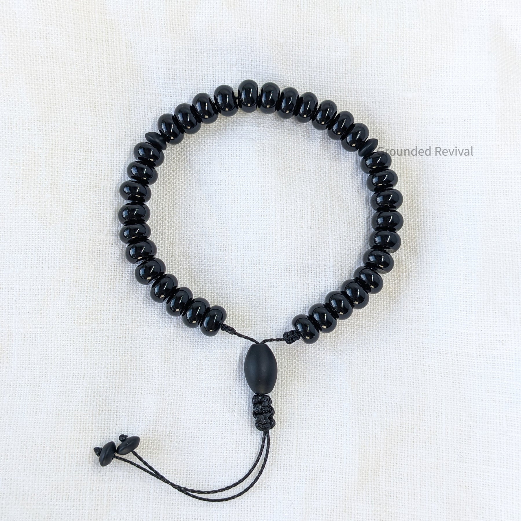 Strength in simplicity. These Muslim prayer beads are handcrafted with polished Black Aqeeq rondelle beads, each 5x8mm, and strung on a durable, fray-resistant cord. Black Aqeeq is prized for its deep, jet-black surface and subtle natural luster, giving each bead a refined yet commanding presence. The disc shape ensures a superior fit around the wrist, creating a steady, tactile feel during dhikr or daily wear. Finished with a sliding macramé lock braid and adjustable knots, this bracelet blends resilience, versatility, and timeless style.