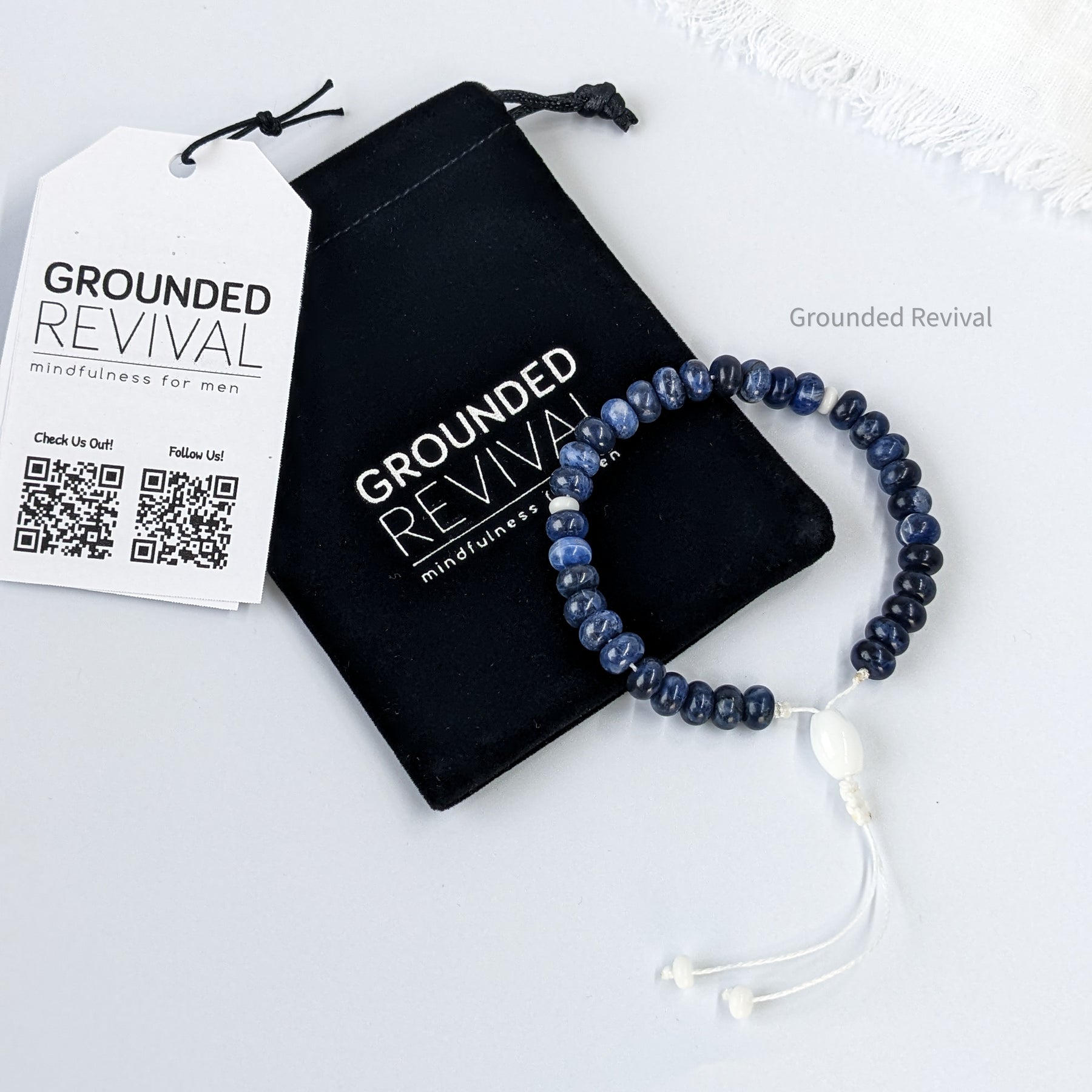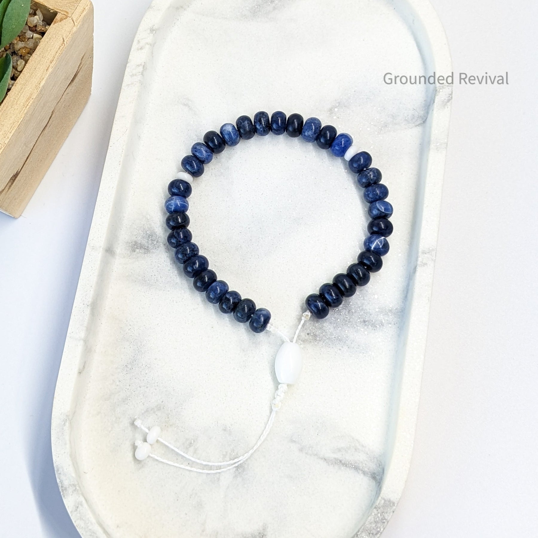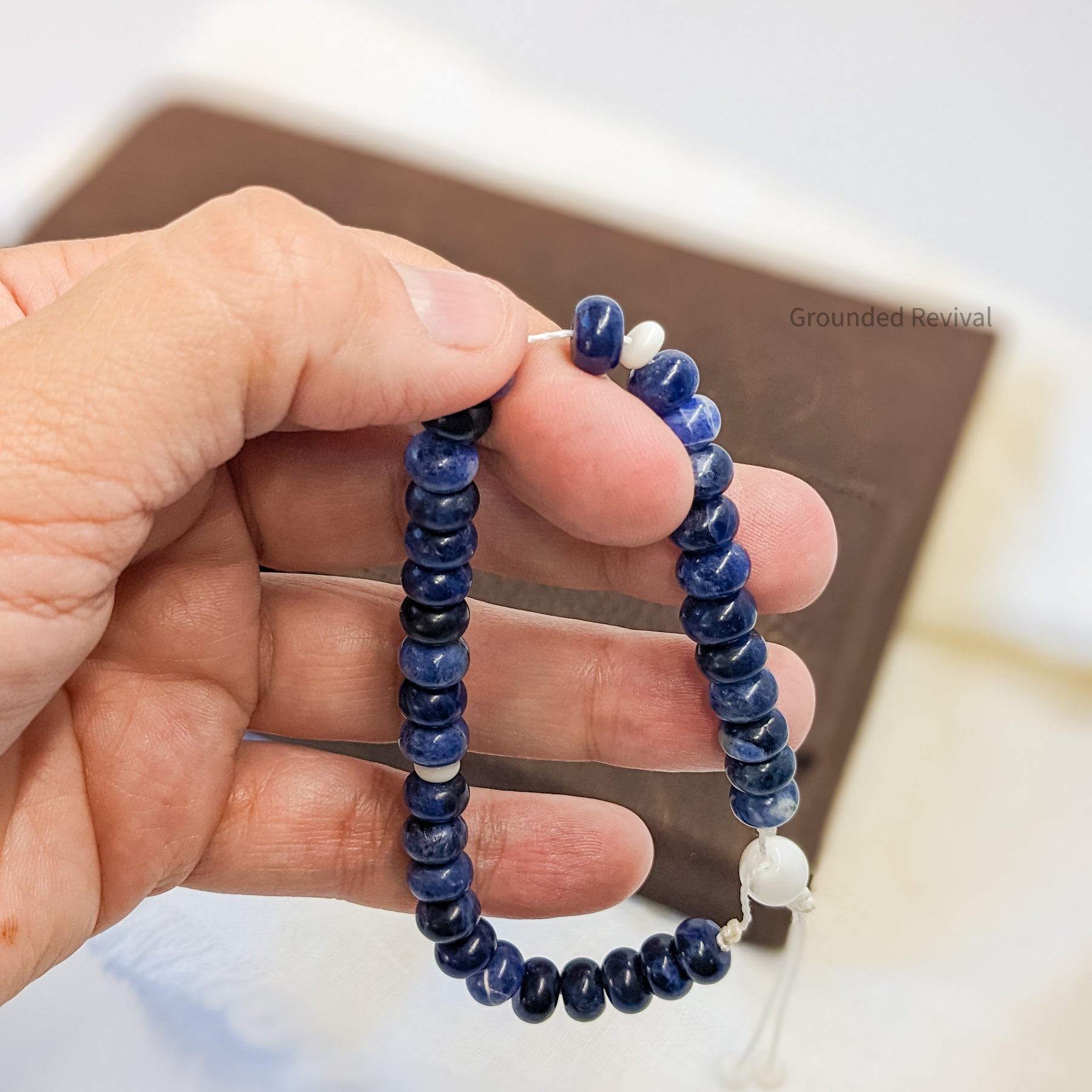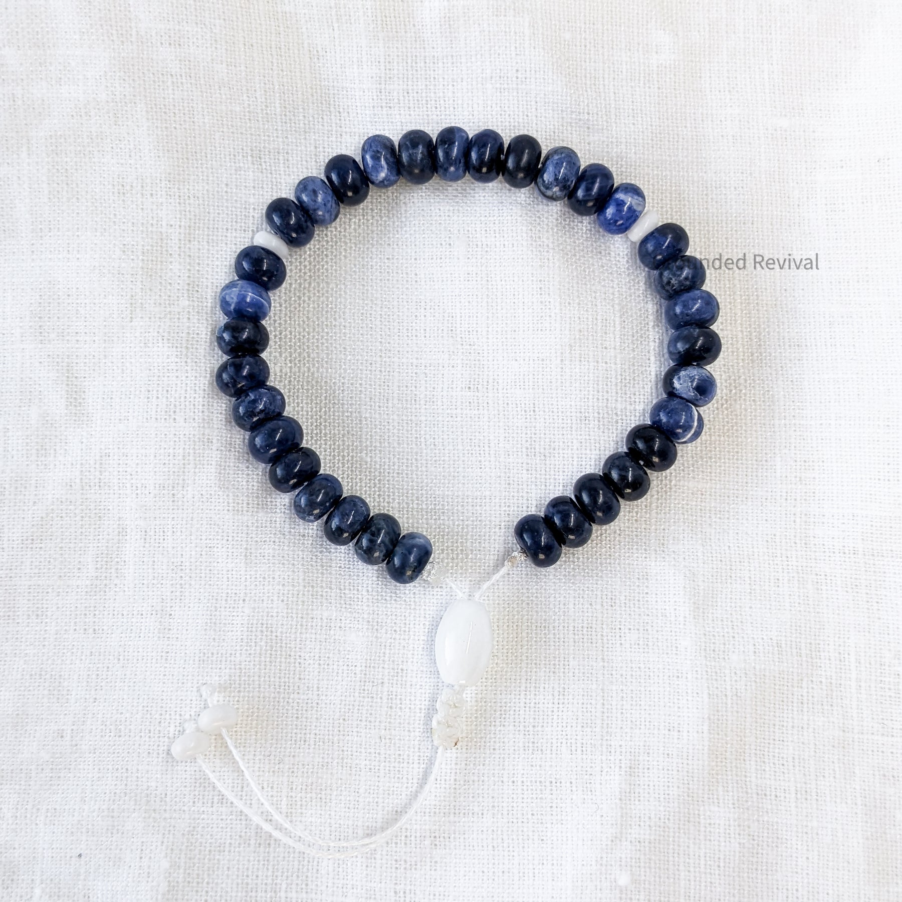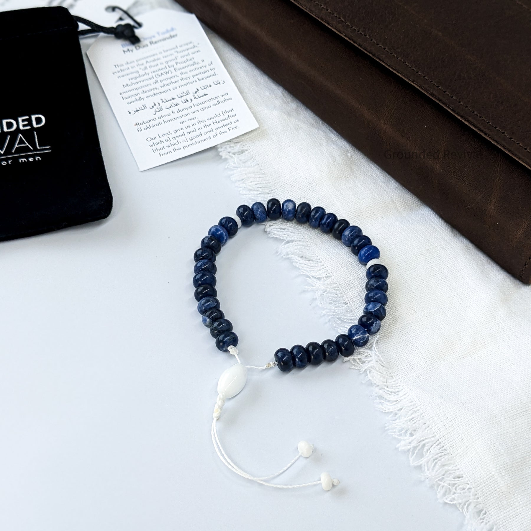Defined by depth. These tasbih beads are handcrafted with Blue Sodalite rondelle beads, each 5x8mm, and strung on a strong, fray-resistant cord. Known for its striking navy-blue tones streaked with white veining, Blue Sodalite carries a bold contrast that makes every bead unique. The disc shape provides an improved wrist fit, offering a steady, tactile feel that enhances both prayer and daily wear. Finished with a sliding macramé lock braid and adjustable knots, this bracelet delivers durability with refined strength.