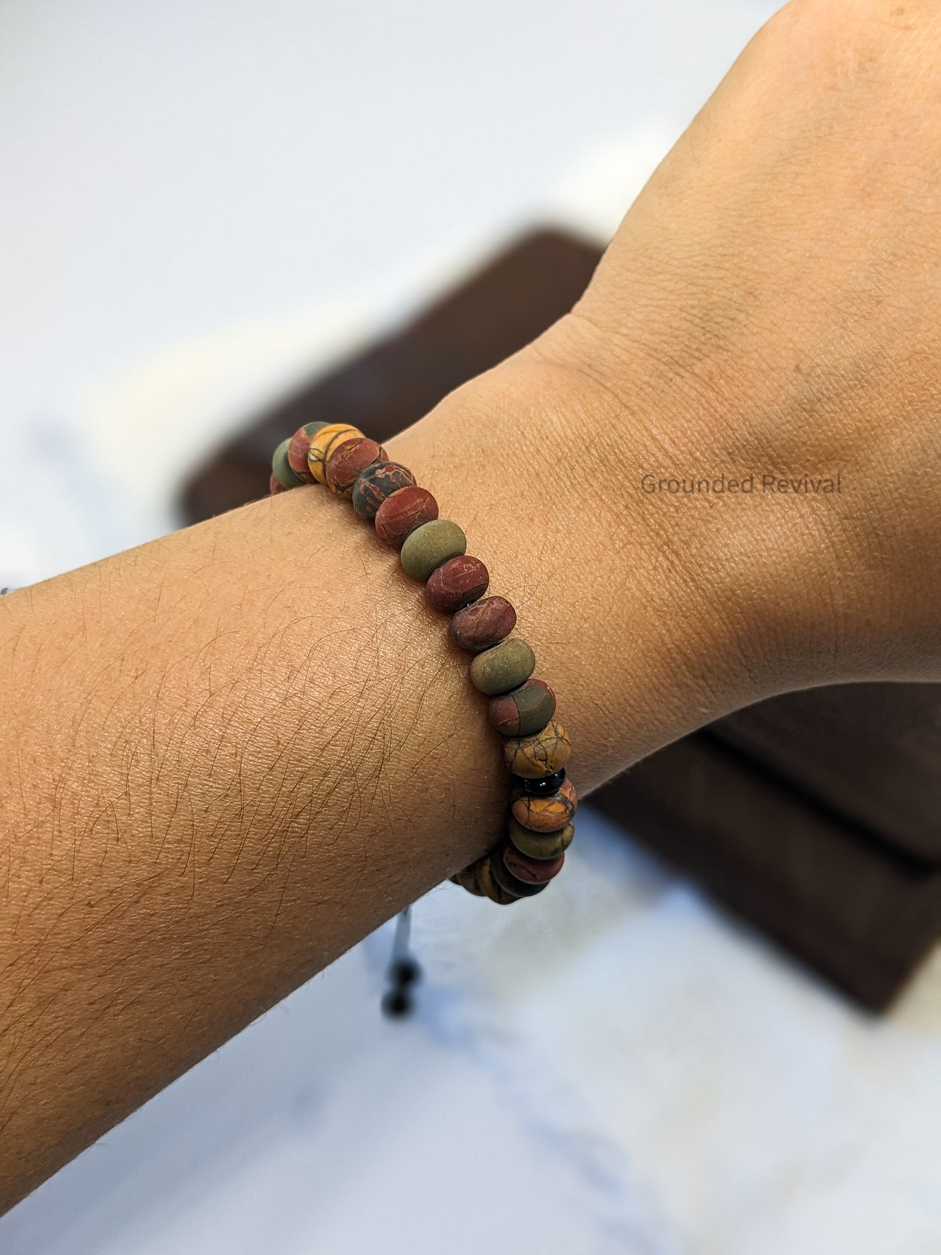 Distinct by design. This tasbih bracelet is handcrafted with Matte Red Picasso rondelle beads, each 5x8mm, and strung on a durable, fray-resistant cord. Known for its natural mix of deep reds, grays, and earthy taupe tones, Red Picasso stone reveals a rugged marbled pattern unique to every bead. The matte finish softens the surface, giving a smooth, non-reflective feel that enhances both comfort and control. The disc shape ensures a balanced fit around the wrist, offering a refined yet grounded tactile experience. Finished with a sliding macramé lock braid and adjustable knots, this bracelet delivers lasting strength and subtle sophistication.
